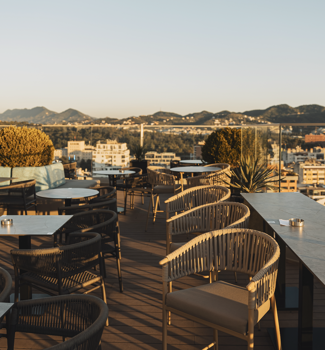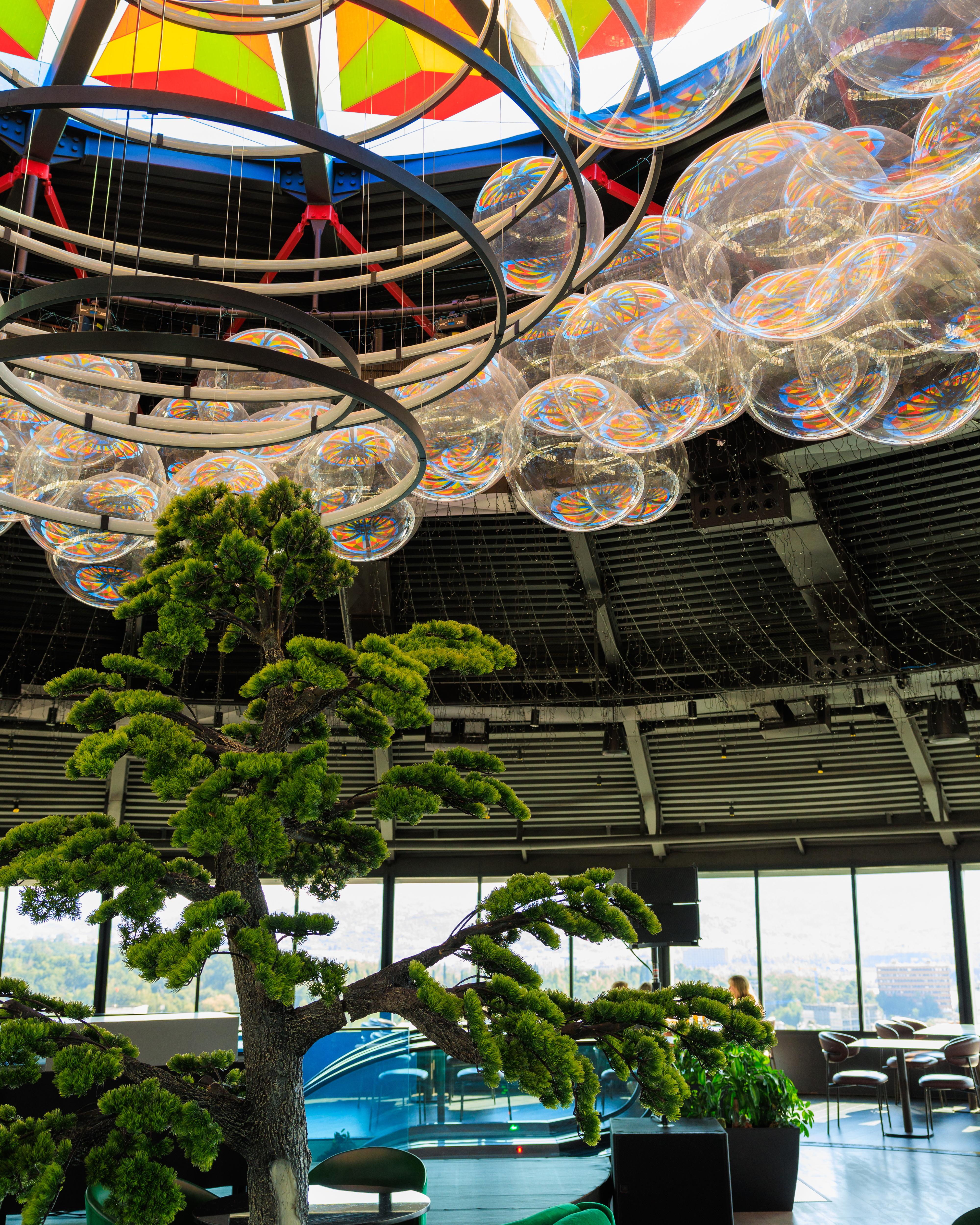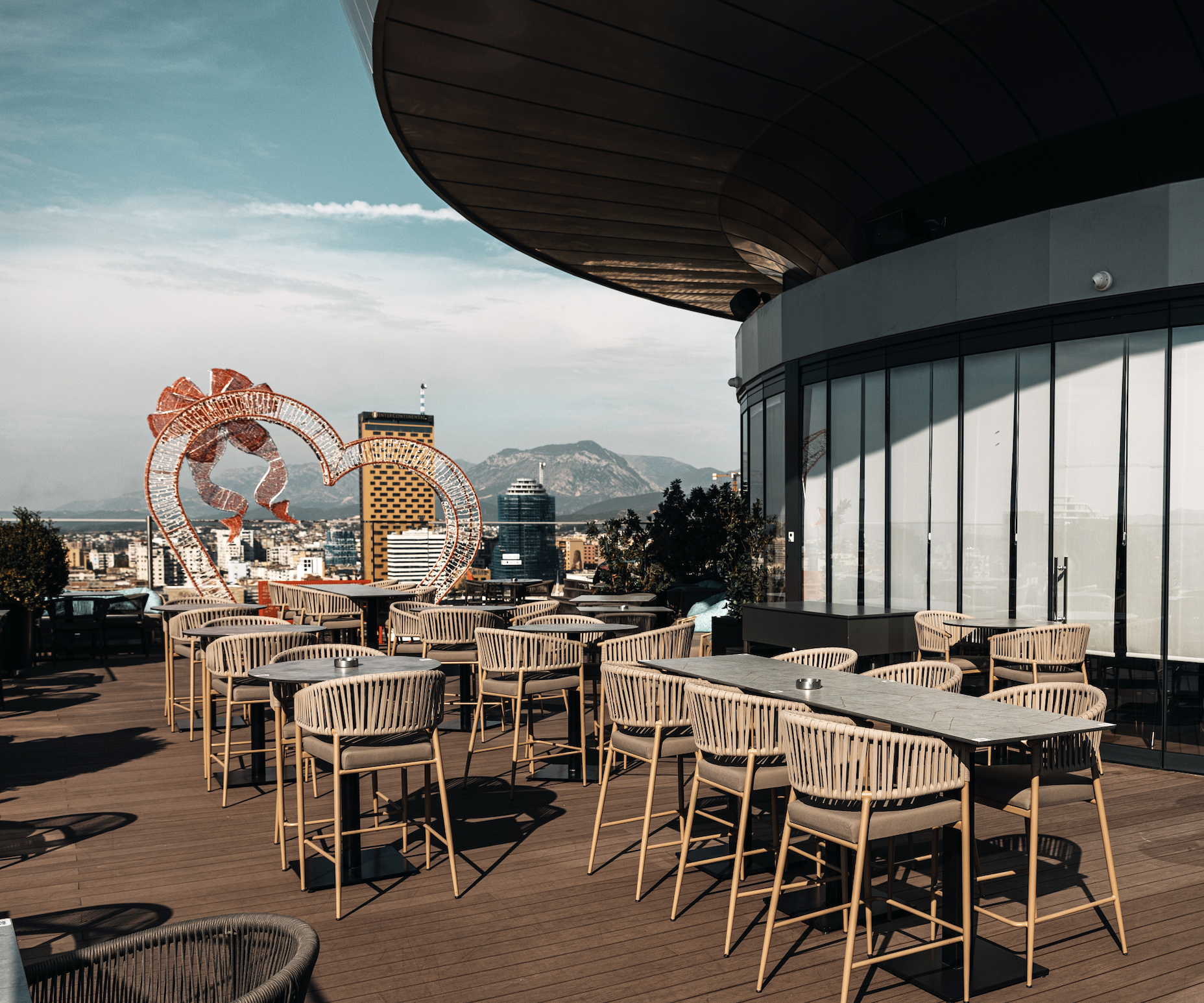SKY CLUB, originally built in 2001, was one of the tallest buildings in Tirana and home to the country’s first rotating bar, designed by renowned local engineer. In 2023, the building was transformed into the largest rotating bar in the Balkan region. Designed to inspire a sense of timelessness, the structure resembles a floating vessel above the city. The bar’s windows offer a unique perspective of Tirana’s bustling streets as they slowly turn, while high enough to gaze into the horizon and admire the mountains that encircle the city—a natural beauty that adds depth and tranquility to the view. At the heart of the bar stands a tree, symbolizing life within the boundless universe, crowned by a vibrant mosaic glass that reflects the many colors of life, reminding us to appreciate the precious moments we have in this vast, endless world.